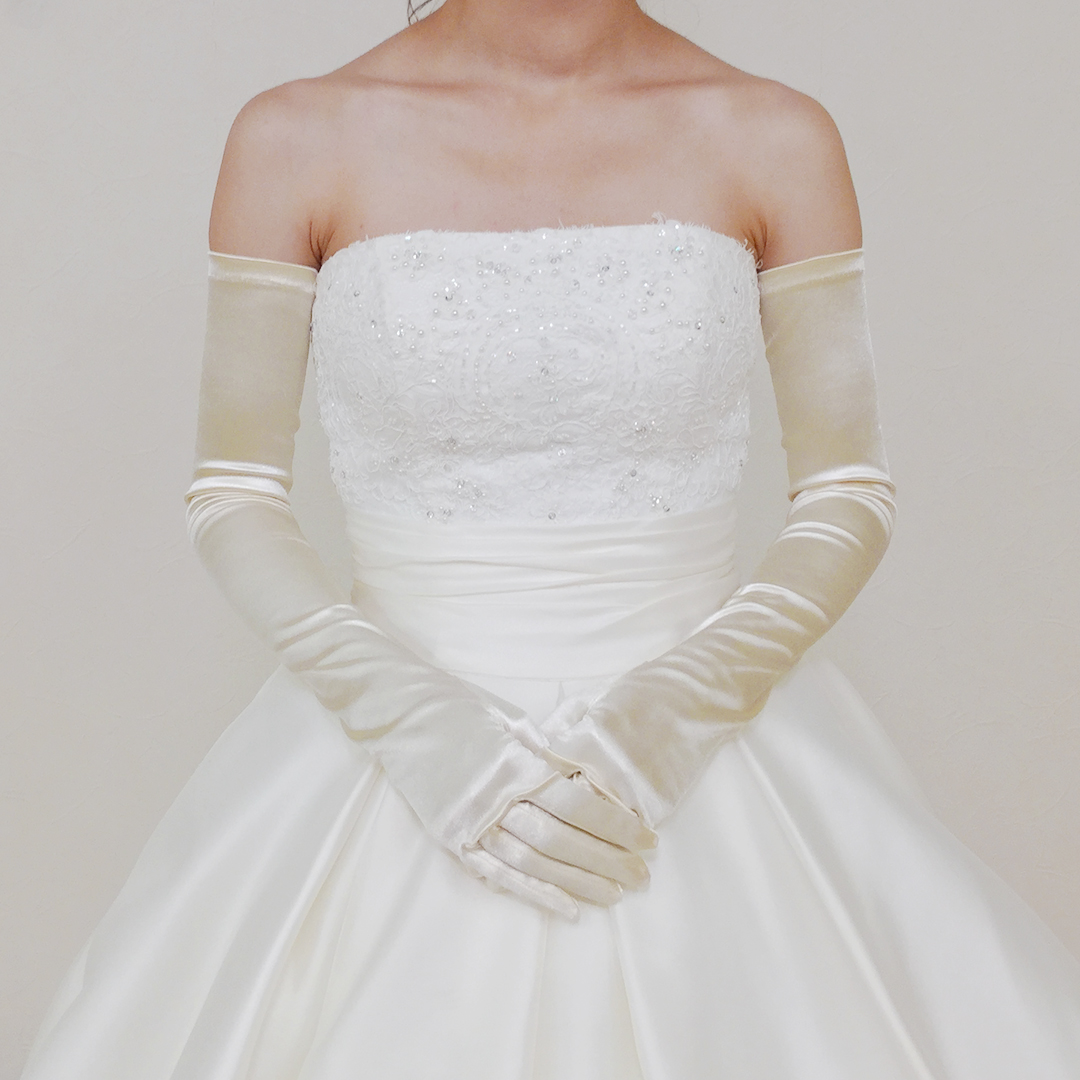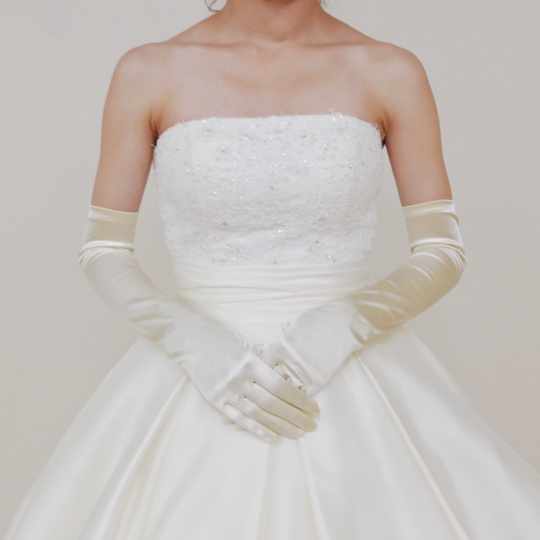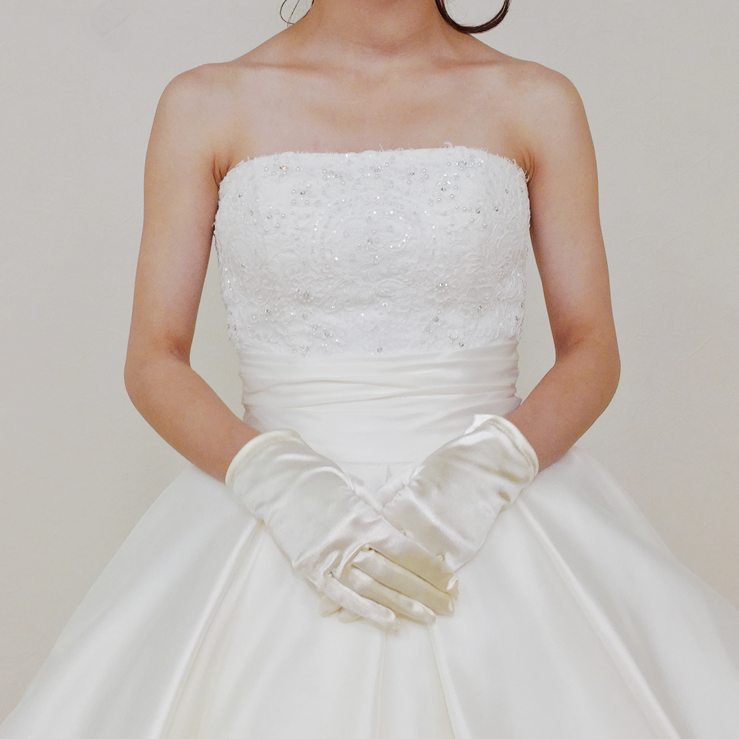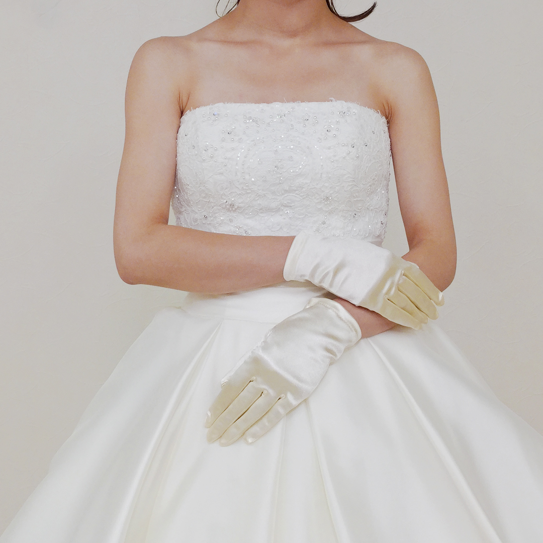 ウエディングドレス用のグローブです。サテン素材のグローブでサイズは4種類。シンプルなデザインは挙式会場やバンケットを選ばずにお使いいただけます。
