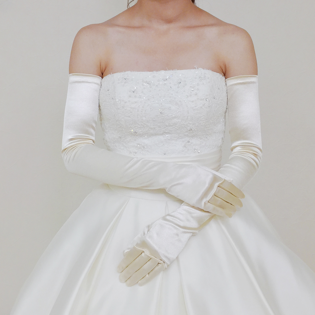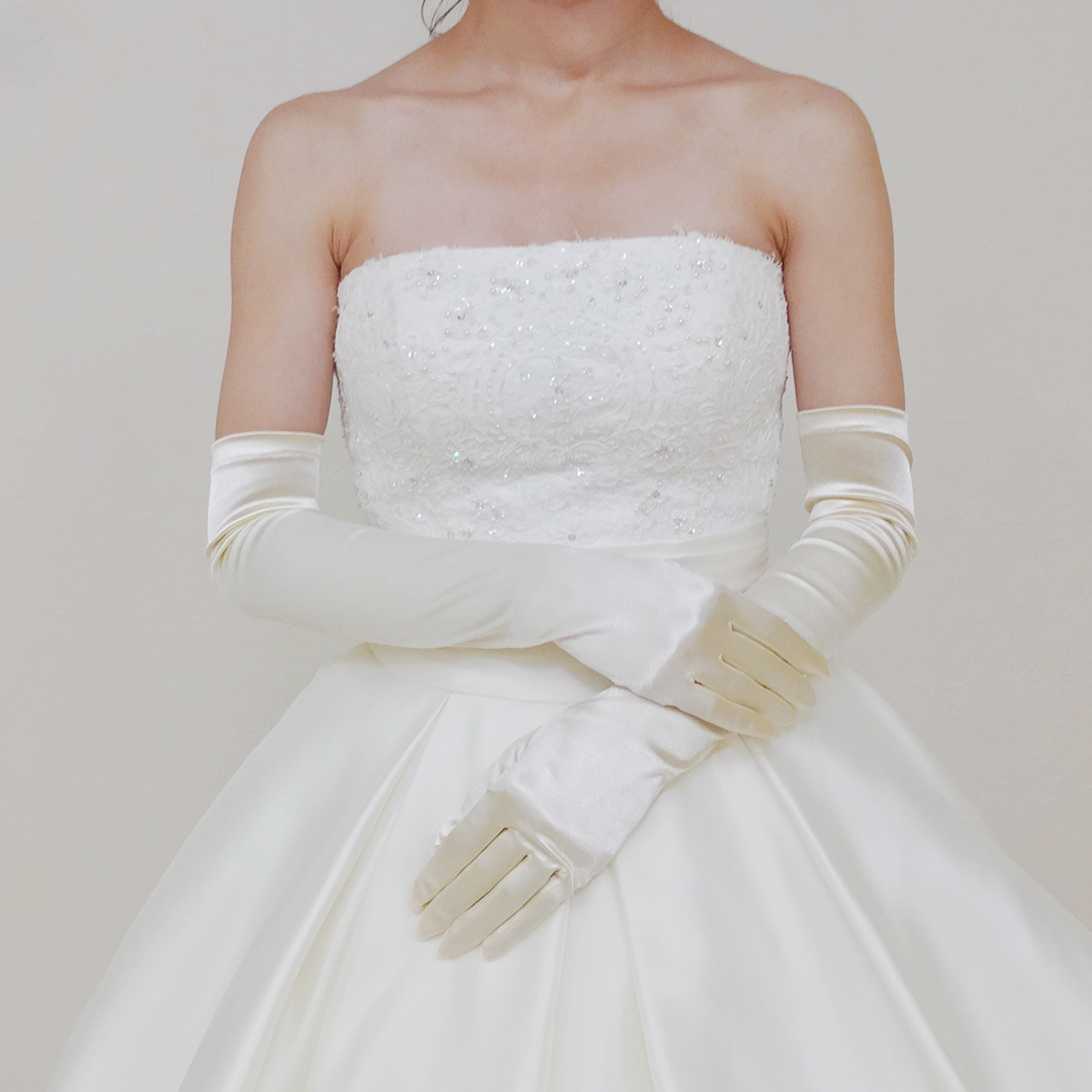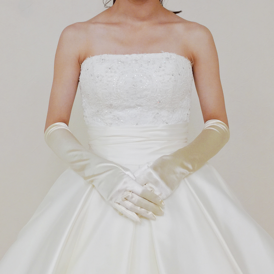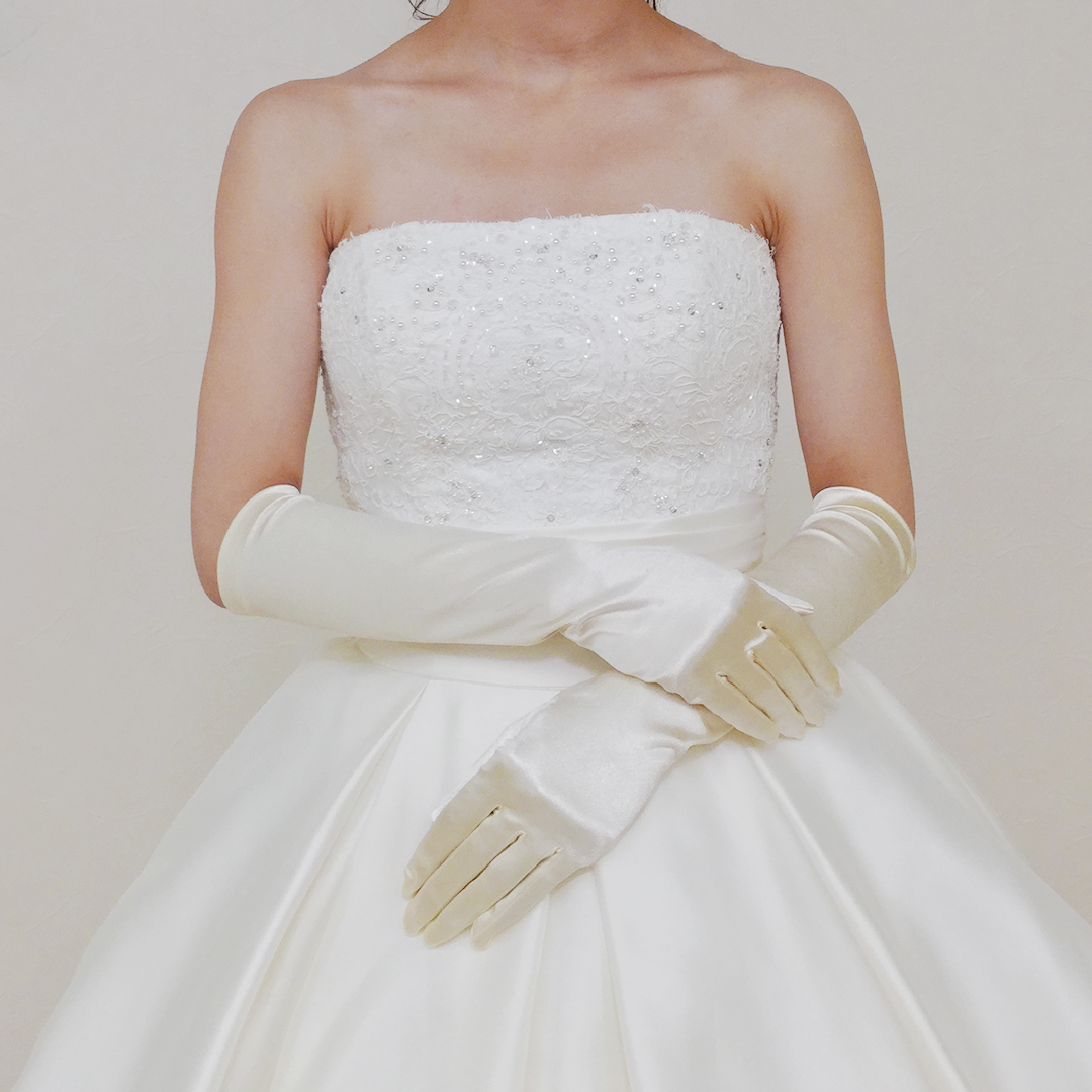 ウエディングドレス用のグローブです。サテン素材のグローブでサイズは4種類。シンプルなデザインは挙式会場やバンケットを選ばずにお使いいただけます。