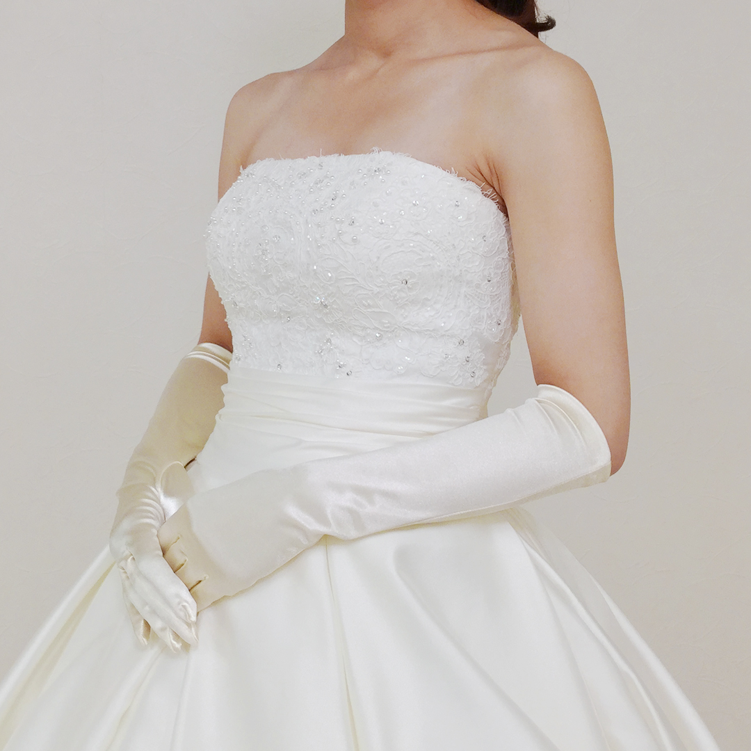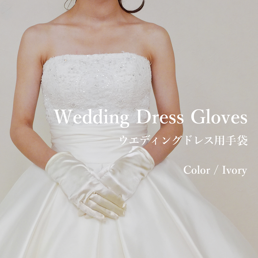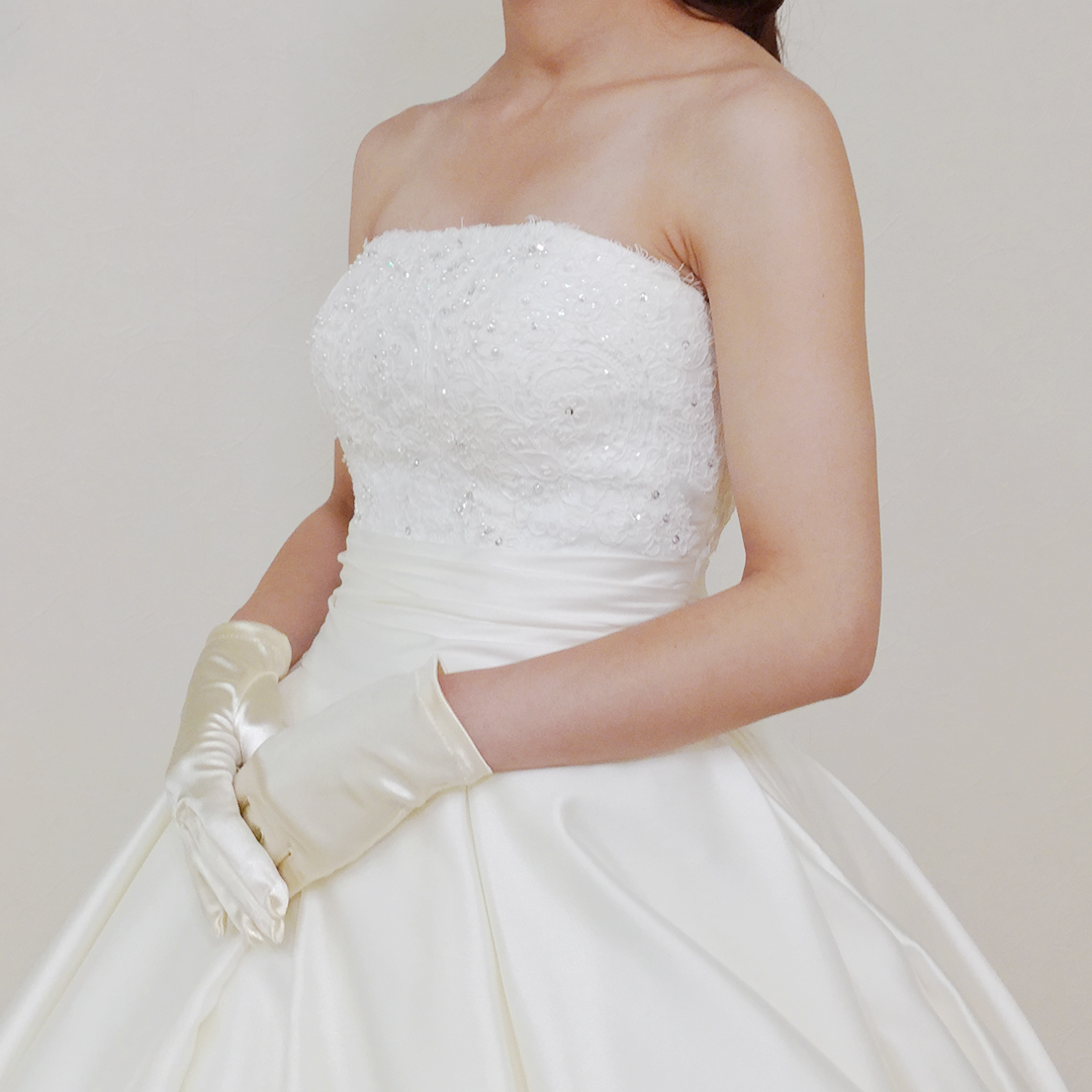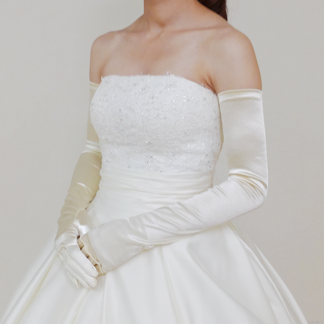 ウエディングドレス用のグローブです。サテン素材のグローブでサイズは4種類。シンプルなデザインは挙式会場やバンケットを選ばずにお使いいただけます。
